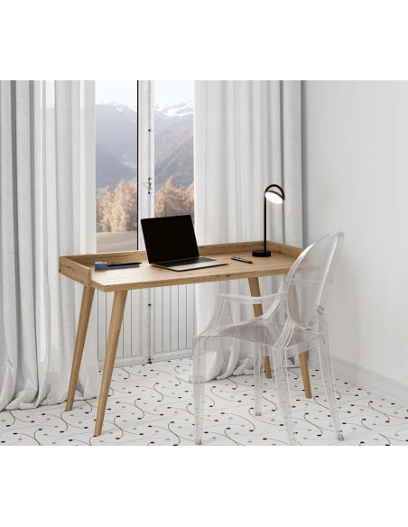 Escritorio con patas de madera modelo Natura. Práctico y sencillo escritorio fabricado con tableros melamínicos de primera calidad, resistentes al impacto, fácil de limpiar y con propiedades antibacterianas y antivíricas.