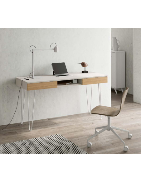 Escritorio con cajones patas horquilla modelo Natura. Práctico y sencillo escritorio con dos cajones y hueco fabricado con tableros melamínicos de primera calidad, resistentes al impacto, fácil de limpiar y con propiedades antibacterianas y antivíricas y patas metálicas con forma de horquilla.