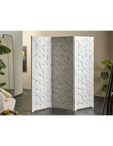 Biombo separador tallado Blanco. Un biombo separador que aporta estilo y privacidad. Con su estructura de madera tallada, esta pieza destaca por su textura.
