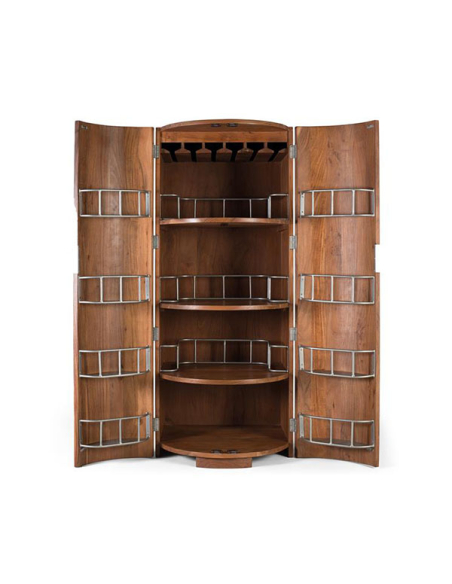Mueble bar cofre vertical 2 puertas, presenta un diseño vertical tipo cofre que añade un toque de misterio y elegancia a tu espacio. Sus dos puertas curvas de madera ofrecen un acceso fácil y conveniente al interior, mientras que añaden un elemento decorativo que realza su belleza y atractivo visual. Las manijas metálicas plateadas en las puertas no solo añaden un toque de estilo y sofisticación, sino que también ofrecen un agarre firme y seguro al abrir y cerrar el mueble. En el interior del mueble, encontrarás estantes con compartimientos metálicos diseñados específicamente para almacenar botellas de licor y otros accesorios de bar. Estos compartimientos mantienen tus bebidas organizadas y al alcance de la mano, facilitando la preparación de cócteles y bebidas para tus invitados. Además, en la parte superior del mueble encontrarás una zona dedicada para colgar copas, proporcionando un espacio conveniente para almacenar y exhibir tu cristalería favorita. Esta característica funcional no solo optimiza el espacio, sino que también añade un toque de elegancia y sofisticación al mueble.