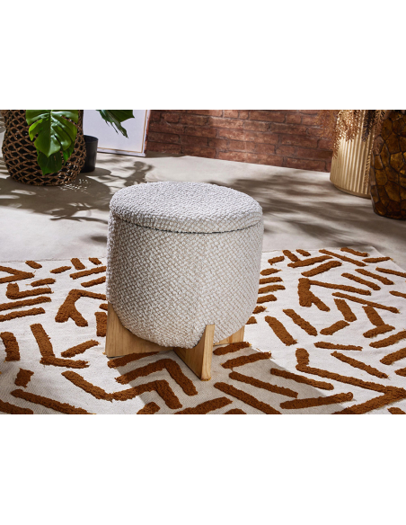 Puff bucle natural con pie madera negra, destaca por su diseño original y moderno, convirtiéndose en un elemento esencial para cualquier hogar contemporáneo. La base de madera encastrable asegura una estabilidad óptima, mientras que la superficie tapizada en un suave textil ofrece un toque acogedor y elegante. Su estética versátil lo hace ideal para usar como asiento adicional, reposapiés o incluso como mesa auxiliar en espacios como salas de estar o dormitorios. Con este puff, podrás añadir un toque de estilo y funcionalidad a tu decoración.