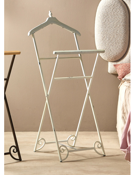 Galán forja y madera decapado, es una pieza funcional y estilizada que se adapta perfectamente a cualquier dormitorio. Con detalles curvos en la base que añaden un toque de elegancia, su diseño combina estética y practicidad. La cadena de seguridad en la zona central de la base garantiza una mayor estabilidad y soporte, mientras que la pintura con efecto añejo proporciona un acabado distintivo y atractivo. La percha de madera en la parte superior no solo ofrece un lugar ideal para colgar prendas, sino que también añade un elemento cálido al conjunto.