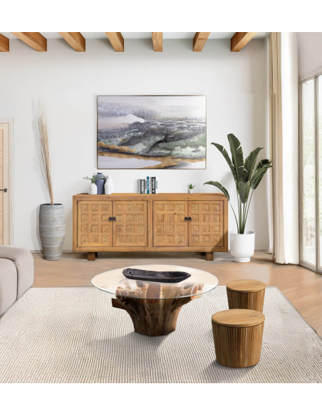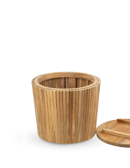 Stool teka con almacenaje, combina funcionalidad y estilo en una sola pieza. Su estructura de madera redonda, con varillas que recorren todo el contorno, le otorgan un aire rústico y elegante, ideal para cualquier espacio. La tapa de madera, fácilmente removible, permite acceder a la práctica cavidad interna, ofreciendo un espacio de almacenamiento adicional para mantener el orden. Perfecto para salones, entradas o dormitorios, este banco es ideal tanto como asiento como pieza de almacenamiento, integrando diseño y utilidad en un solo mueble.