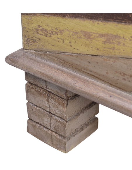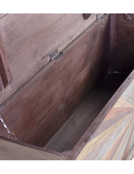 Baúl Alhambra rústico colores, con una estética rústica y única. La tapa cuenta con un soporte de cadenas para facilitar su apertura, mientras que las manijas en los laterales permiten un fácil manejo. Las patas cuadradas elevadas ofrecen estabilidad y elevan la pieza, dándole un toque elegante. La estructura es de color marrón con detalles en múltiples tonos, creando un efecto envejecido que resalta la belleza natural de la madera. El cerramiento metálico en el frente añade un detalle industrial que combina perfectamente con el estilo rústico, convirtiendo este baúl en una pieza decorativa funcional ideal para almacenar y organizar en cualquier espacio.
