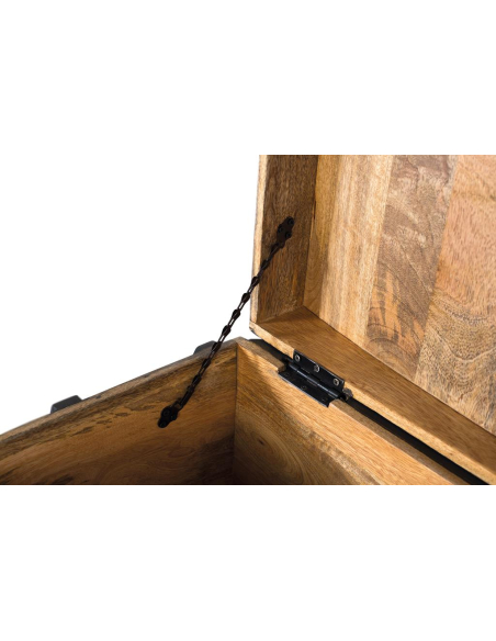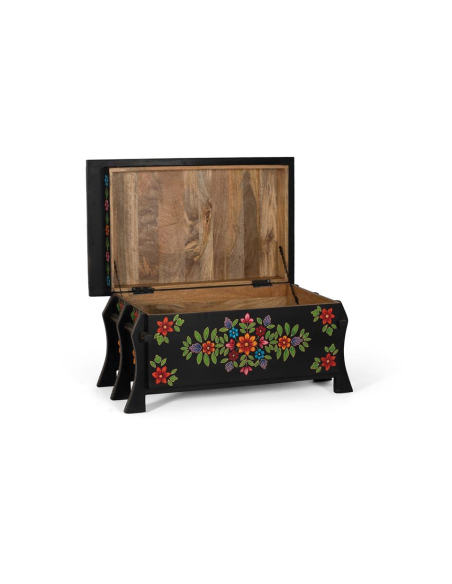 Baúl flores negro, fabricado en madera de mango de color negro, una pieza funcional y decorativa que combina el estilo rústico con un toque vibrante. Toda la superficie está pintada a mano con flores de diferentes colores, creando un contraste único y llamativo que le da vida y carácter a cualquier habitación. El baúl cuenta con tres patas en cada uno de sus laterales, lo que le proporciona estabilidad y un diseño elegante. Su tapa curva se abre para revelar un amplio espacio de guardado, ideal para almacenar ropa, mantas u otros objetos. Este baúl no solo es una solución práctica para el almacenamiento, sino también una obra de arte que aporta un toque colorido y distintivo a cualquier espacio.
