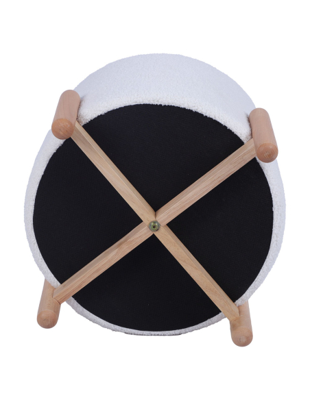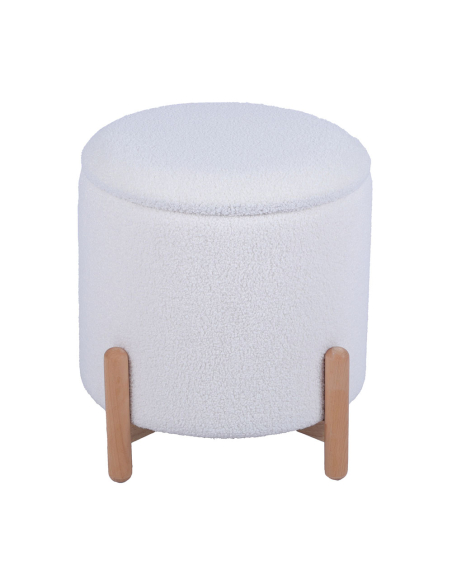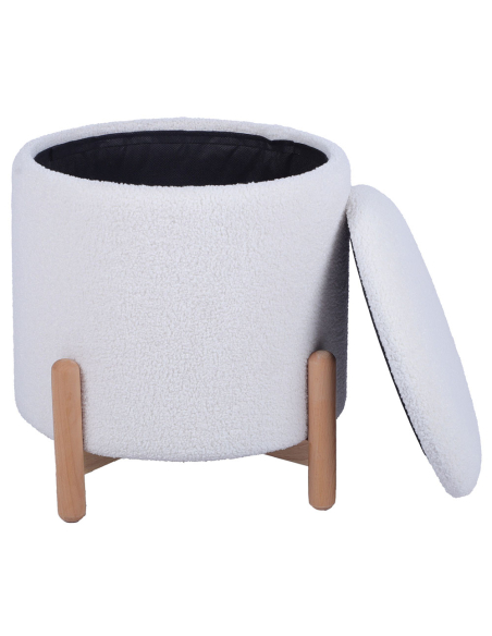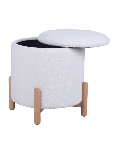 Puf con almacenamiento blanco y madera, combina funcionalidad y estilo con su diseño minimalista y moderno. Tapizado en tela blanca de textura suave y duradera, aporta elegancia y luminosidad a cualquier espacio. Sus patas de madera natural no solo ofrecen estabilidad, sino también un toque cálido y natural que encaja perfectamente en ambientes nórdicos, bohemios o contemporáneos. El asiento acolchado proporciona comodidad adicional, mientras que el interior espacioso permite organizar y guardar objetos cotidianos como mantas, libros o juguetes, manteniendo el orden en el hogar.