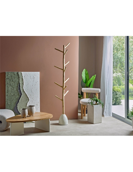 Perchero pie ramas Dolken 190 cm, con su estructura que recuerda a un árbol estilizado, está elaborado con ramas de madera, que le otorgan un aspecto orgánico y auténtico. La base, con un acabado que simula la piedra, proporciona estabilidad y un contraste interesante con la madera. Los múltiples "brazos" del perchero ofrecen un amplio espacio para colgar abrigos, sombreros, bufandas y otros accesorios, manteniéndolos organizados y al alcance de la mano.