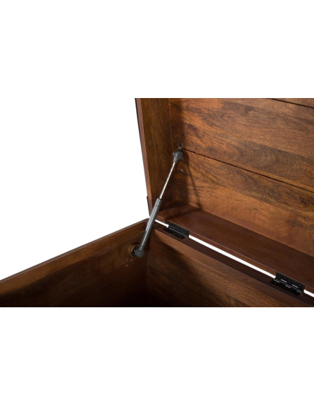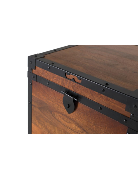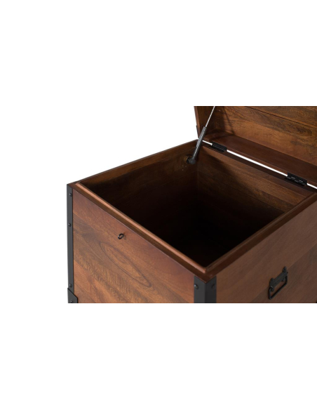 Baúl cuadrado madera, recupera el encanto de los antiguos cofres de viaje con una construcción sólida en mango macizo y herrajes negros vistos. El acabado avellana resalta las vetas y nudos naturales, mientras que las cantoneras y remaches aportan un aire industrial muy actual. El formato cúbico permite usarlo como mesa auxiliar o pieza de apoyo en el dormitorio, el salón o el recibidor, multiplicando su utilidad sin ocupar espacio visual. Pensado para acompañarte muchos años, integra apertura asistida mediante amortiguador para un manejo seguro y silencioso, además de asas laterales que facilitan moverlo cuando lo necesites. En su generoso interior caben mantas, cojines, álbumes o juguetes, convirtiéndose en un imprescindible del orden. La base incluye protectores para el suelo y el acabado protector se limpia fácil con un paño ligeramente humedecido, manteniendo su pátina cálida intacta.