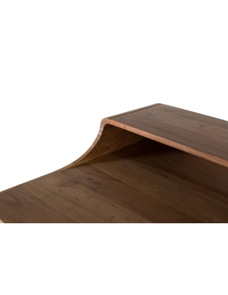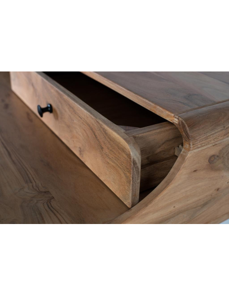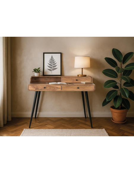 Escritorio 3 cajones con curvas, de líneas suaves que equilibra calidez y funcionalidad. La tapa y los frentes en madera de acacia lucen vetas orgánicas y bordes curvos que suavizan el conjunto, mientras las patas cónicas de metal negro aportan un guiño industrial. Incluye tres cajones de deslizamiento suave para guardar papelería y accesorios, además de una repisa superior con práctico pasacables para mantener tu laptop y cargadores siempre ordenados. Ideal para home office pequeños o creativos, combina con estilos nórdico, contemporáneo e industrial ligero.