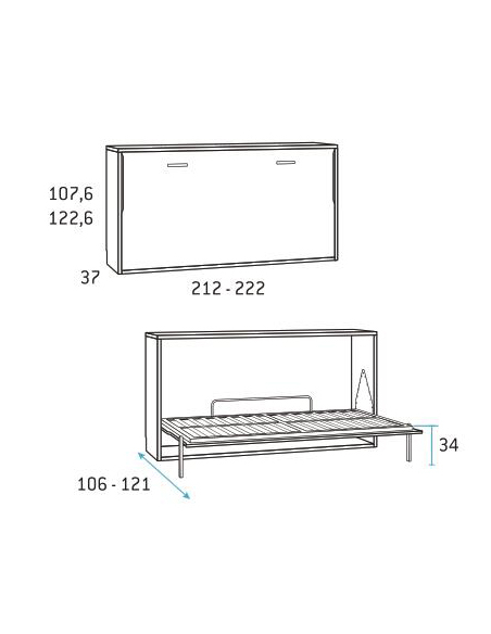 - Cama baja abatible horizontal con cama de 105 x 200 cm ↔ 222 ↗ 37 ↕ 122,6 cm - Abierta ocupa 121 cm.