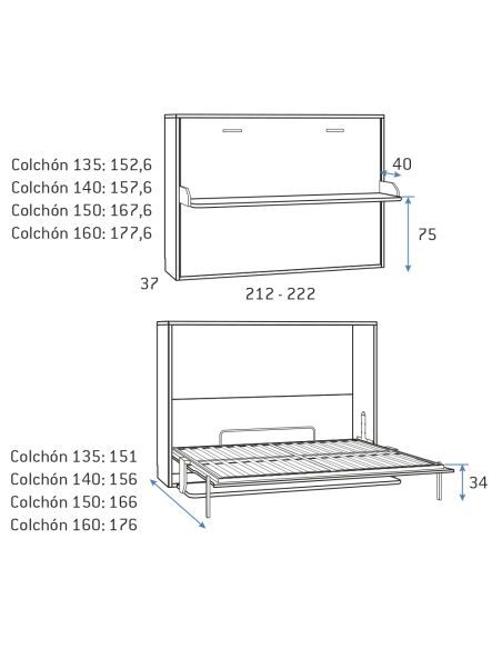 - Cama baja abatible horizontal con cama de 135 x 190 cm: ↔ 212 ↗ 37 ↕ 157,6 cm - Abierta ocupa 156 cm.