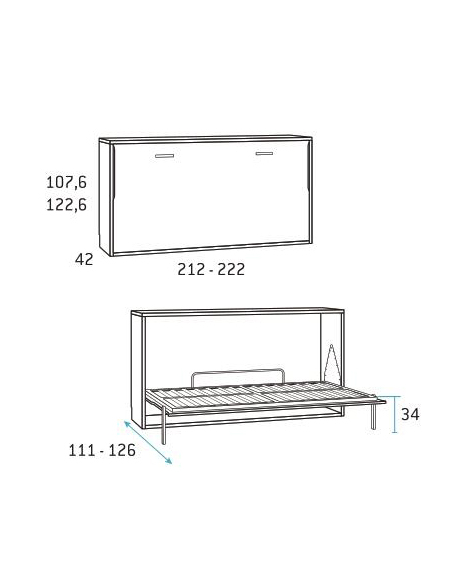 - Cama baja abatible horizontal con cama de 105 x 200 cm ↔ 222 cm ↗ 42 cm ↕ 122,6 cm - Abierta ocupa 126 cm.