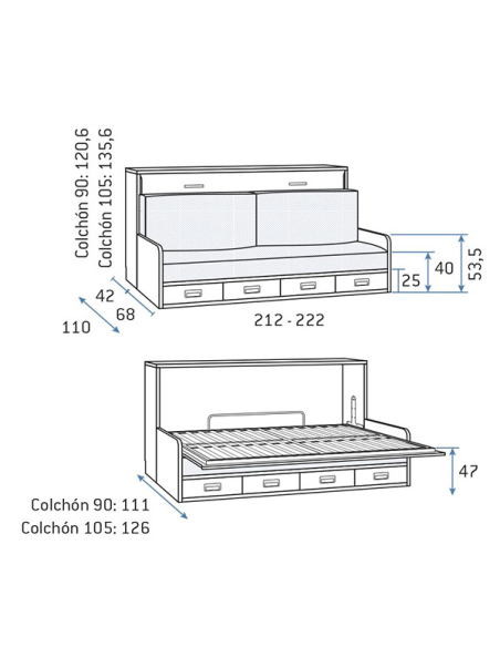 - Cama baja abatible horizontal con cama de 105 x 200 cm: ↔ 222 cm ↗ 110 cm (42+68) ↕ 135,6 cm - Abierta ocupa 126 cm.