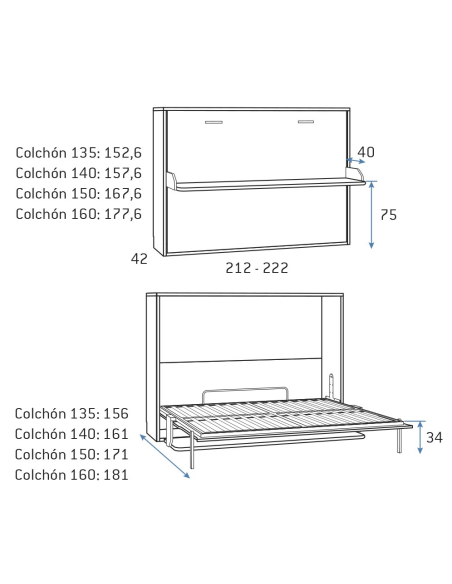 - Cama abatible horizontal con cama de 135 x 190 cm: ↔ 212 cm ↗ 42 cm ↕ 152,6 cm - Abierta ocupa 156 cm.