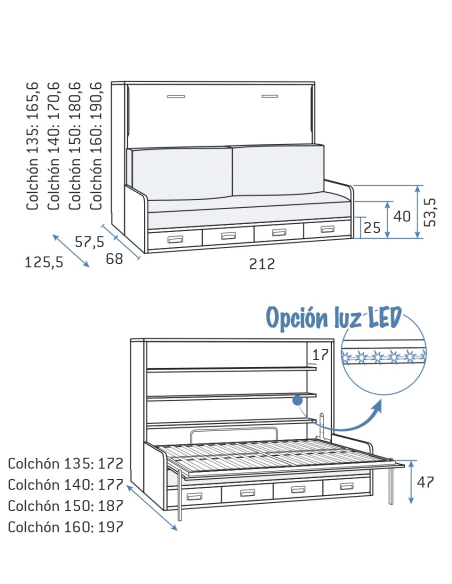 1. Cama abatible horizontal con cama de 135 x 190 cm       212 cm  ↗ 125,5 cm (57,5+68 cm)  165,6 cm - Abierta ocupa 172 cm.