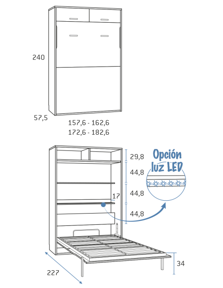 4. Cama baja abatible vertical con cama de 160 x 190 cm       182,6 cm ↗ 57,5 cm ↕ 240 cm - Abierta ocupa 227 cm.