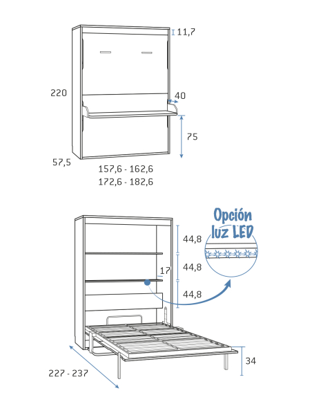 - Cama baja abatible vertical con cama de 160 x 190 cm ↔ 182,6 cm ↗ 57,5 cm ↕ 220 cm - Abierta ocupa 227 cm.