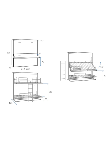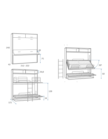 - 90 x 200: ↔ 222 cm ↗ 42 cm ↕ 240 cm - Abierta ocupa 121 cm.