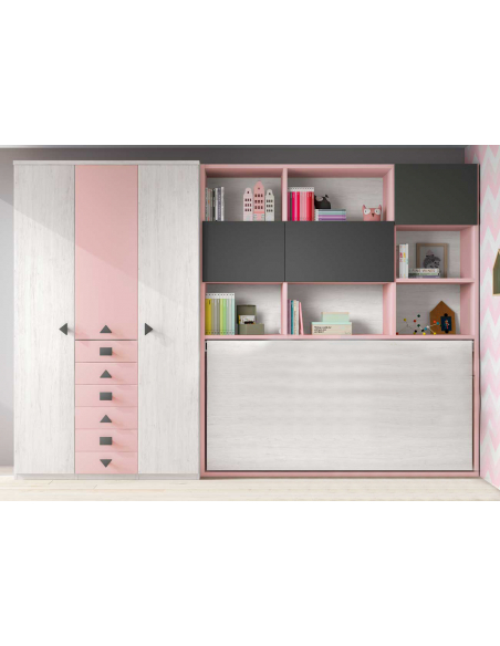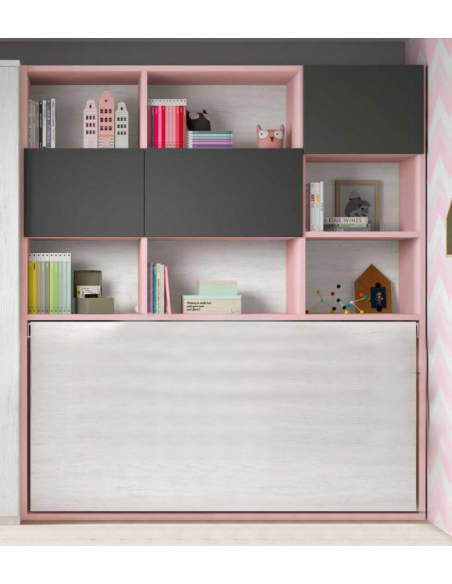 Cama abatible alta horizontal baja con librero superior con cama de 90 o 105 x 190 o 200 cm. Una manera práctica de ahorrar espacio.