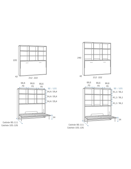 - 105 x 200: ↔ 222 cm ↗ 42 cm ↕ 220/240 cm - Abierta ocupa 126 cm.