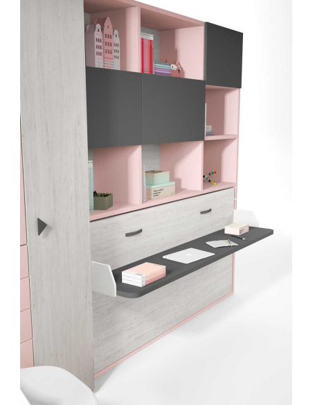 Si la habitación tiene poco espacio y lo necesitas libre para las actividades diarias, no puedes dejar escapar esta cama abatible alta horizontal con librero, con cama de 90 o 105 x 190 cm y encimera. Una manera de tener lo básico de una habitación en poco espacio.