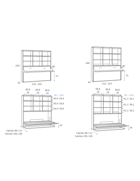 • 105 x 200: ↔ 222 cm ↗ 42 cm ↕ 240 cm - Abierta ocupa 126 cm.