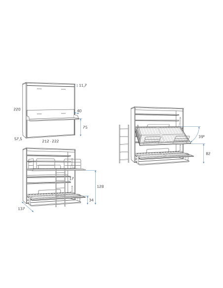 • 90 x 200: ↔ 222 cm ↗ 57,5 cm ↕ 220 cm - Abierta ocupa 137 cm.