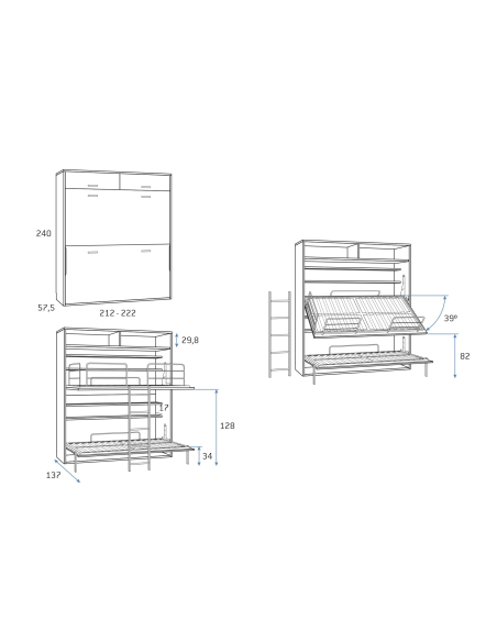 • 90 x 200:   ↔ 222 cm ↗ 57,5 cm ↕ 240 cm - Abierta ocupa 137 cm.