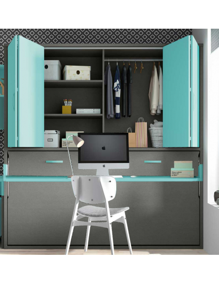 Si la habitación tiene poco espacio y lo necesitas libre para las actividades diarias, no puedes dejar escapar esta cama abatible horizontal doble con cama de 90 x 190, 90 x 200, 105 x 90 o 105 x 200 cm y con armario en la parte superior y encimera. Una manera de tener lo básico de una habitación en poco espacio.