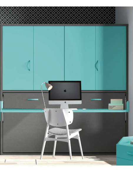 Cama abatible horizontal baja de 90/105 x 190/200 cm con armario de puertas plegables y encimera. Una manera práctica de ahorrar espacio.