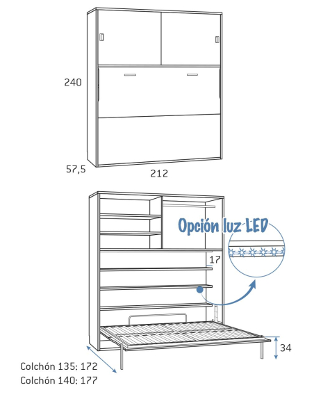 - 135 x 190: ↔ 212 cm ↗ 57,5 cm ↕ 240 cm - Abierta ocupa 172 cm.