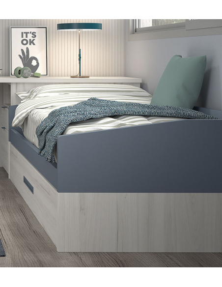 Cómodo y práctico nido bicolor con dos cajones con ruedas donde tendrás una cama alta para colchones de 90 o 105 y de 190 o 200 cm de largo. Cuenta con dos cajones de ruedas en la parte inferior para tener más espacio de almacenaje en caso de necesitarlo. Este modelo incluye una corona decorativa que, además de ayudar a que no se roce o ensucie la pared, podrás elegir un color que destaque sobre los demás para que visualmente quede una pieza más completa.