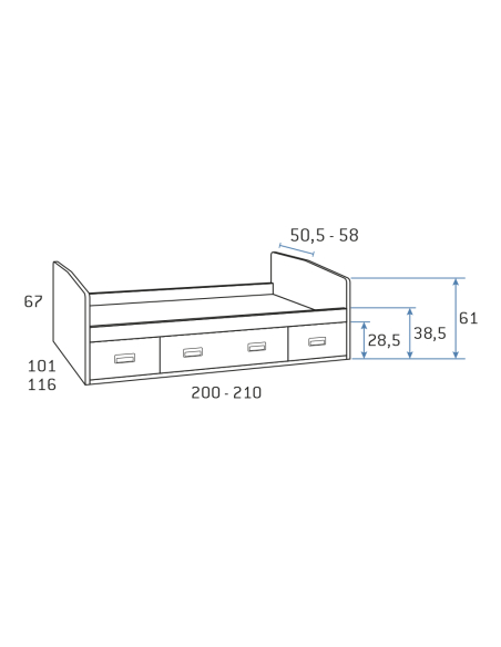 Compacto 200 x 90: ↔ 210 ↗ 101 cm ↕ 67 cm