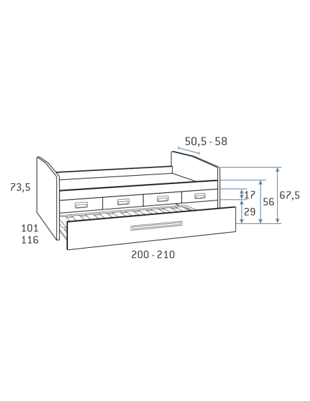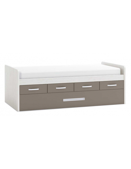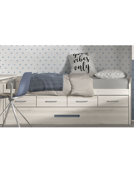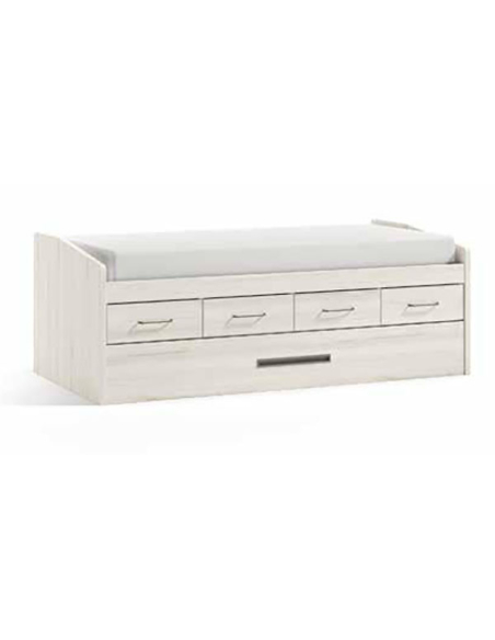 Cómodo y práctico compacto con cuatro cajones y somier arrastre donde tendrás una cama alta para colchones de 90 o 105 y de 190 o 200 cm de largo. Cuenta con cuatro cajones y somier arrastre en la parte inferior para tener espacio extra de almacenaje en caso de necesitarlo y una cama extra.