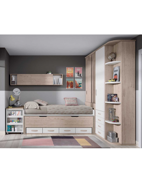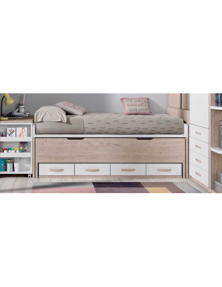 Cómodo y práctico compacto con nido oculto y cuatro cajones donde tendrás una cama alta para colchones de 90 o 105 y de 190 o 200 cm de largo. Cuenta con nido oculto y cuatro cajones bajos en la parte inferior para tener espacio extra de almacenaje en caso de necesitarlo.