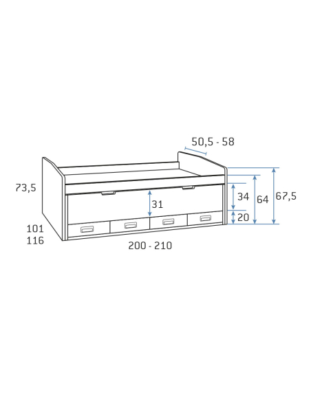 Compacto 200 x 90:   ↔ 210 ↗ 101 cm ↕ 73,5 cm - Nido de 190 x 90