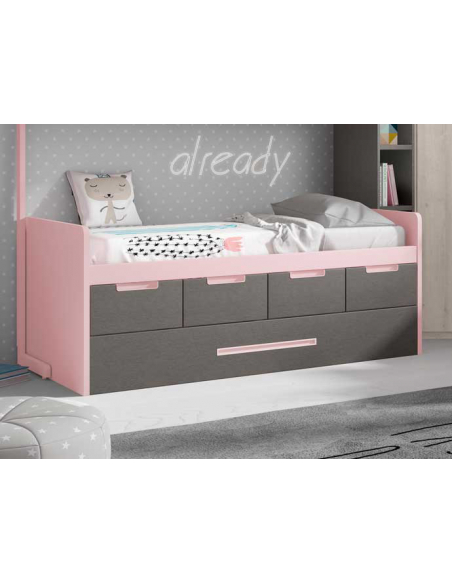 Cómodo y práctico compacto con cuatro cajones y somier de arrastre donde tendrás una cama alta para colchones de 90 o 105 y de 190 o 200 cm de largo. Cuenta con cuatro cajones y somier de arrastre en la parte inferior para tener espacio extra de almacenaje en caso de necesitarlo. Este modelo incluye la posibilidad de añadir o prescindir del cabecero y piecero. Esto ayuda a que quede una visual más completa en el dormitorio y que se puedan aprovechar las alturas para otros muebles. Además, podrás elegir un color en cada pieza que destaque sobre los demás para que visualmente quede una pieza más completa. Podrás elegir entre tres opciones de diseño dependiendo de las necesidades del dormitorio: