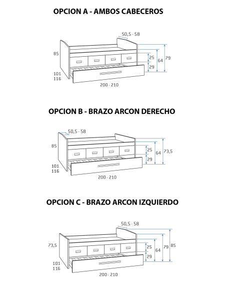 • Opción B tiene el cabecero izquierdo alto y el derecho bajo en caso de unirlo a otra pieza como un armario o un escritorio ya que podría quedar todo corrido y con un mejor aspecto visual.