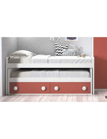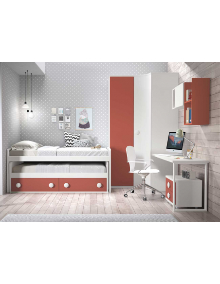 Cómodo y práctico compacto con nido y dos baúles donde tendrás una cama alta para colchones de 90 o 105 y de 190 o 200 cm de largo. Cuenta con nido y dos baúles en la parte inferior para tener espacio extra de almacenaje en caso de necesitarlo. Este modelo incluye la posibilidad de añadir o prescindir del cabecero y piecero. Esto ayuda a que quede una visual más completa en el dormitorio y que se puedan aprovechar las alturas para otros muebles. Además, podrás elegir un color en cada pieza que destaque sobre los demás para que visualmente quede una pieza más completa. Podrás elegir entre tres opciones de diseño dependiendo de las necesidades del dormitorio: