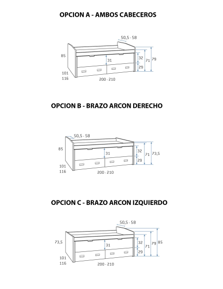 Compacto 200 x 90: ↔ 210 ↗ 101 cm ↕ 85 cm - Nido de 190 x 90