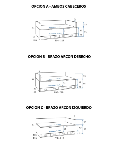 Compacto 200 x 105: ↔ 216 cm ↗ 116 cm ↕ 91 cm - Nido de 200 x 90