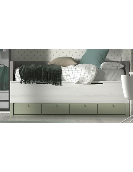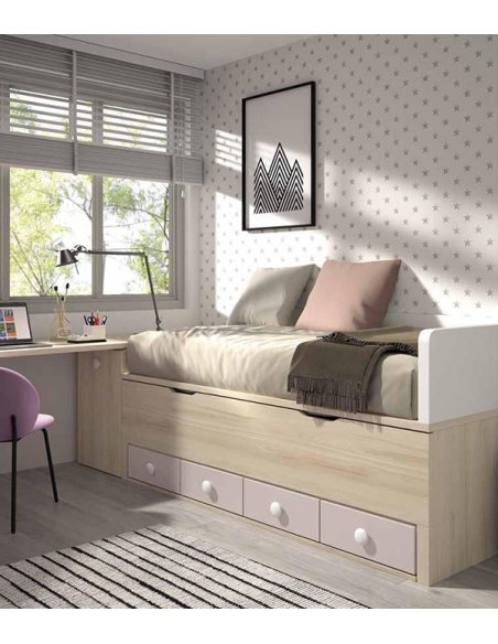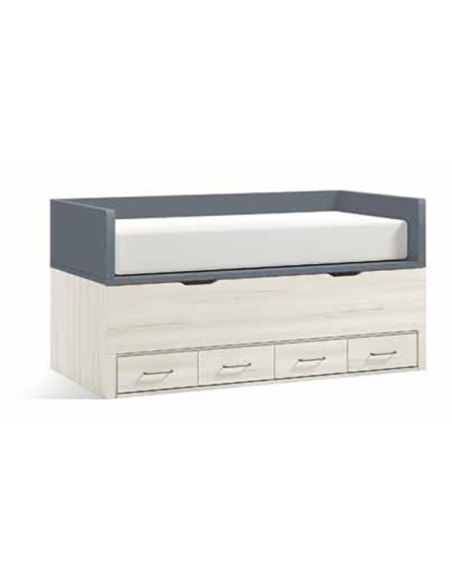 Cómodo y práctico compacto con nido oculto y cuatro baúles bajos donde tendrás una cama alta para colchones de 90 o 105 y de 190 cm de largo. Cuenta con nido oculto y cuatro baúles bajos en la parte inferior para tener una cama extra y espacio extra de almacenamiento en caso de necesitarlo.