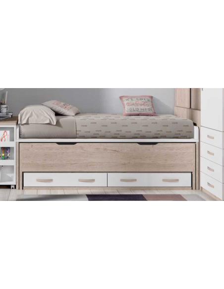 Cómodo y práctico compacto con nido oculto y dos baúles bajos donde tendrás una cama alta para colchones de 90 o 105 y de 190 cm de largo. Cuenta con nido oculto y dos baúles bajos en la parte inferior para tener una cama extra y espacio extra de almacenamiento en caso de necesitarlo.