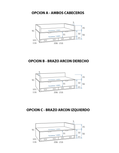 Compacto 200 x 105: ↔ 216 cm ↗ 116 cm ↕ 91 cm - Nido de 200 x 90