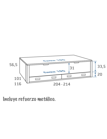 Compacto 200 x 90: ↔ 214 cm ↗ 101 cm ↕ 56,5 cm - Nido de 200 x 90