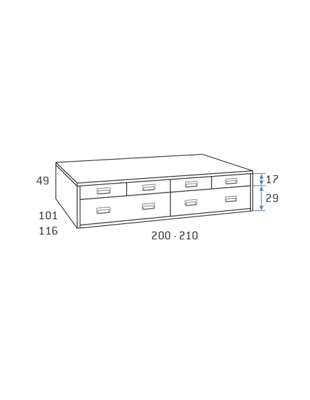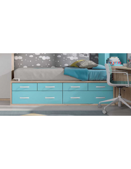 Cómodo y práctico compacto liso con cuatro pequeños cajones superiores y dos baúles donde tendrás una cama para colchones de 90 o 105 de ancho y de 190 o 200 de largo. Cuenta con cuatro pequeños cajones superiores y dos baúles en la parte inferior para tener almacenamiento extra en caso de necesitarlo.