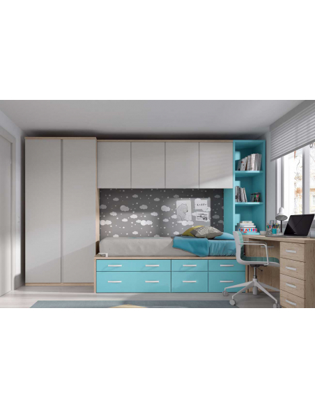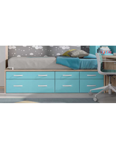 Cómodo y práctico compacto liso con cuatro pequeños cajones superiores y dos contenedores donde tendrás una cama para colchones de 90 o 105 de ancho y de 190 o 200 de largo. Cuenta con cuatro pequeños cajones superiores y dos contenedores en la parte inferior para tener almacenamiento extra en caso de necesitarlo.