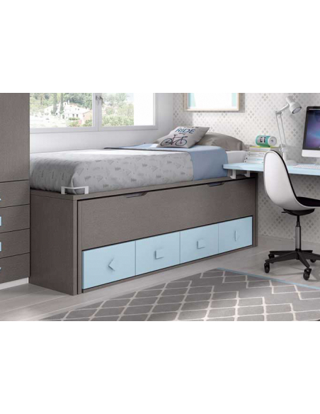 Cómodo y práctico compacto liso con nido oculto y cuatro contenedores, con freno y tirador salvacolchón donde tendrás una cama para colchones de 90 o 105 de ancho y de 190 o 200 de largo. Cuenta con un nido oculto y cuatro contenedores en la parte inferior para tener almacenamiento extra en caso de necesitarlo.