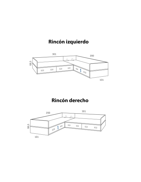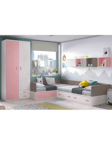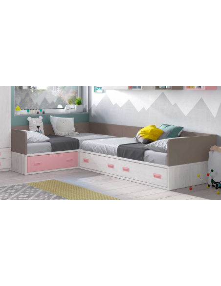Cómodo y práctico compacto doble con rincón a izquierda o derecha y con módulo de tres cajones donde tendrás dos estructuras para colchones de 90 x 190.
