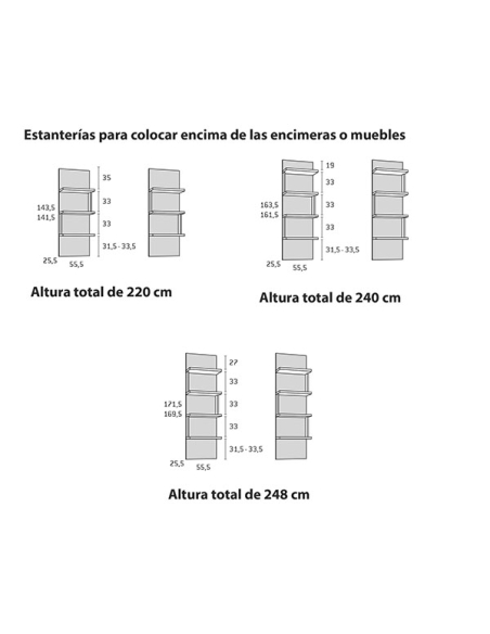 - Para altura de 220 con encimera de 5 cm de grosor: ↔ 55,5 cm ↗ 25,5 cm ↕ 141,5 cm